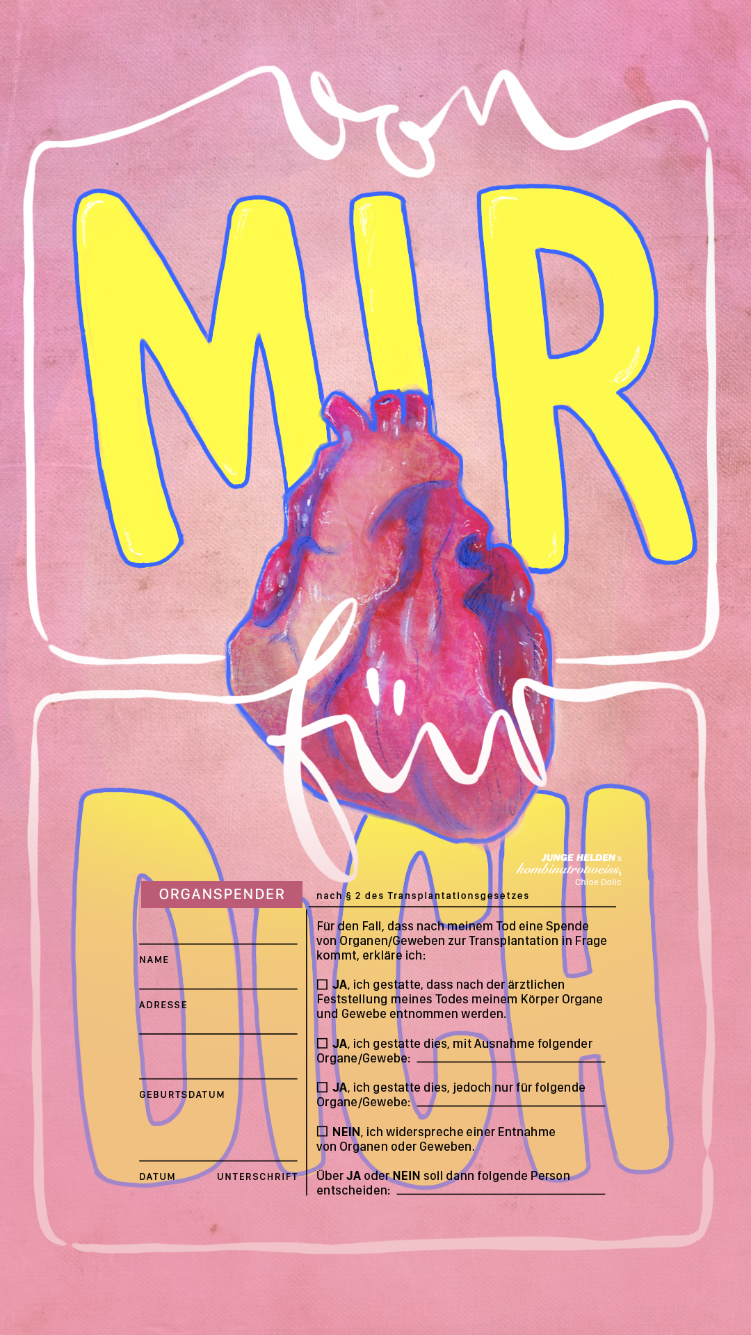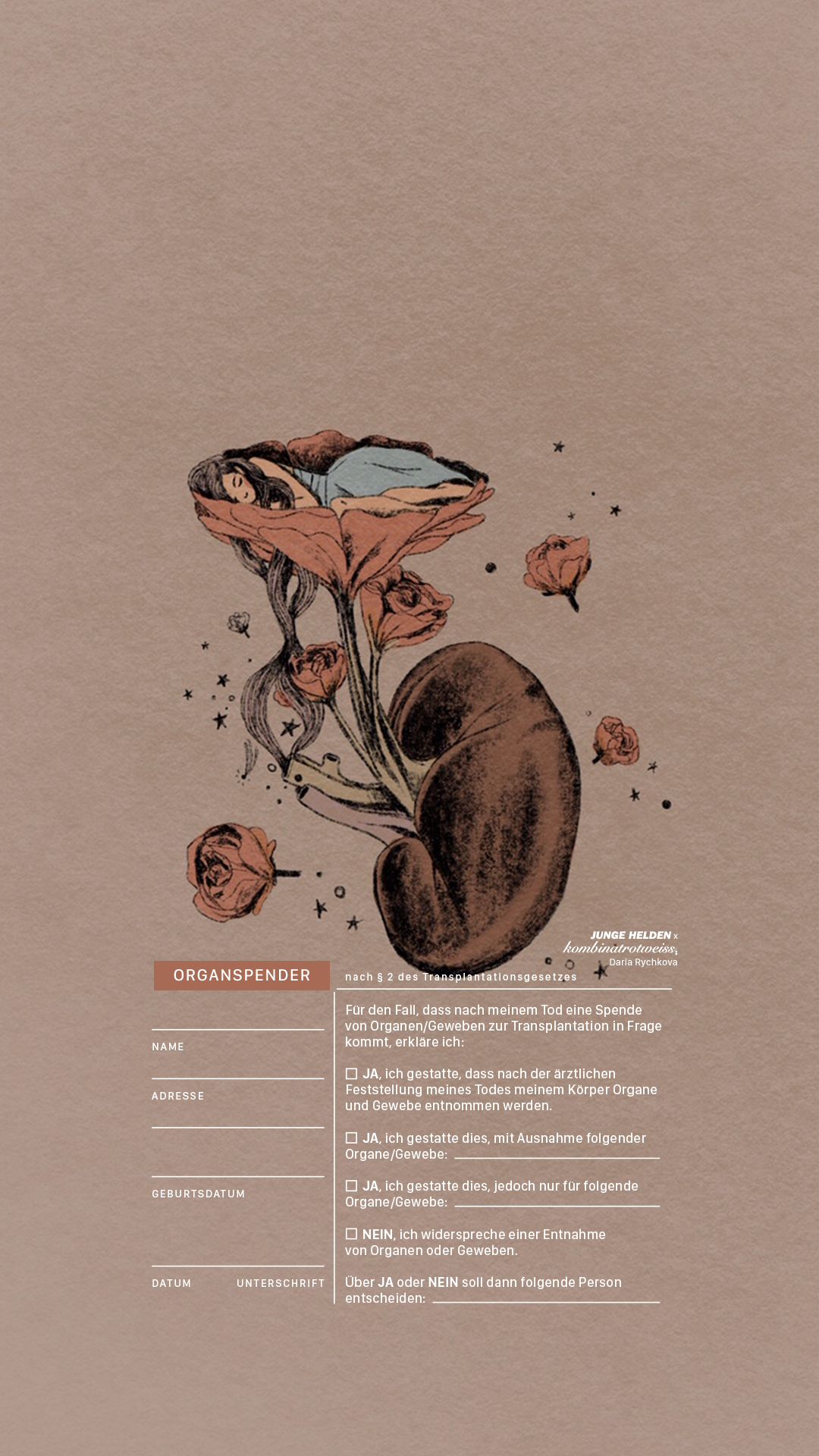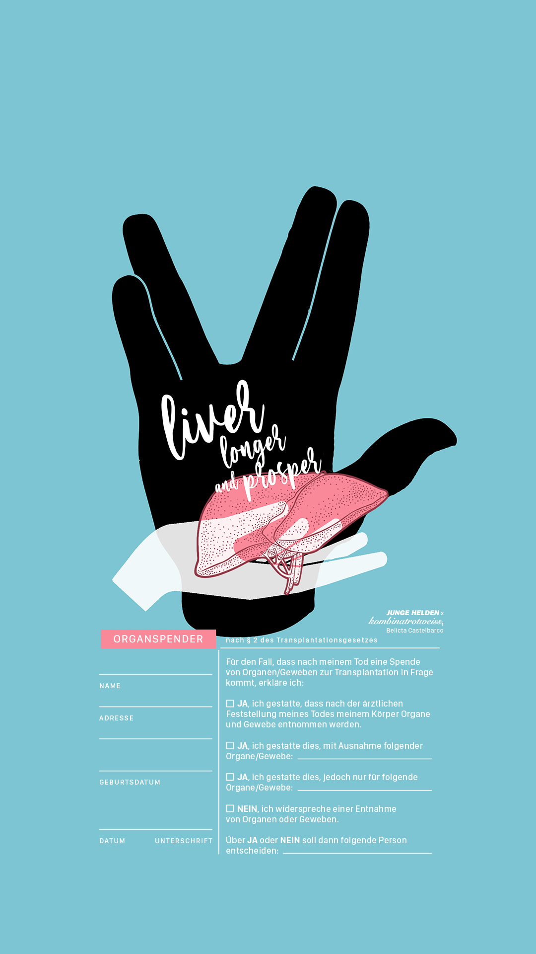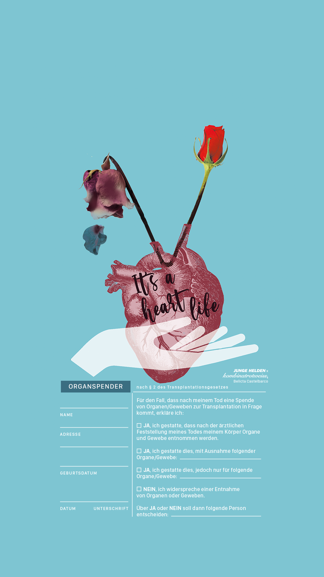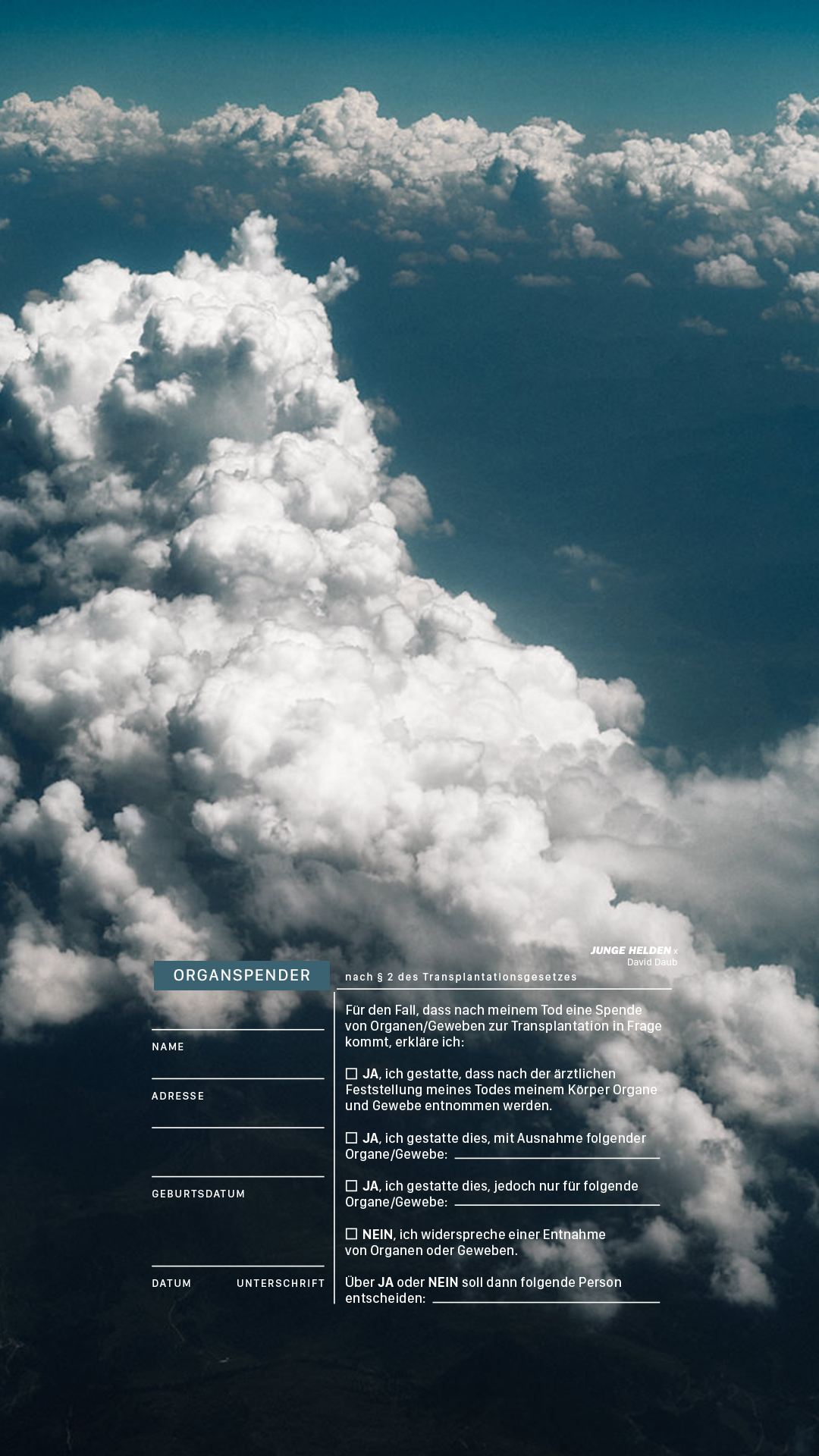 Hier kommt der erste Organspendeausweis fürs Handy! Durch die Life Saving Wallpapers lässt sich der Organspendeausweis mit ein paar Klicks als Wallpaper aufs Handy laden. Du kannst Dir hier eines von knapp 60 Motiven aussuchen, bequem auf dem Handy oder dem Computer bearbeiten und dann als Sperrbildschirm einstellen. Oder nimmst das Overlay und machst Dein eigenes Motiv zum Life Saving Wallpaper.