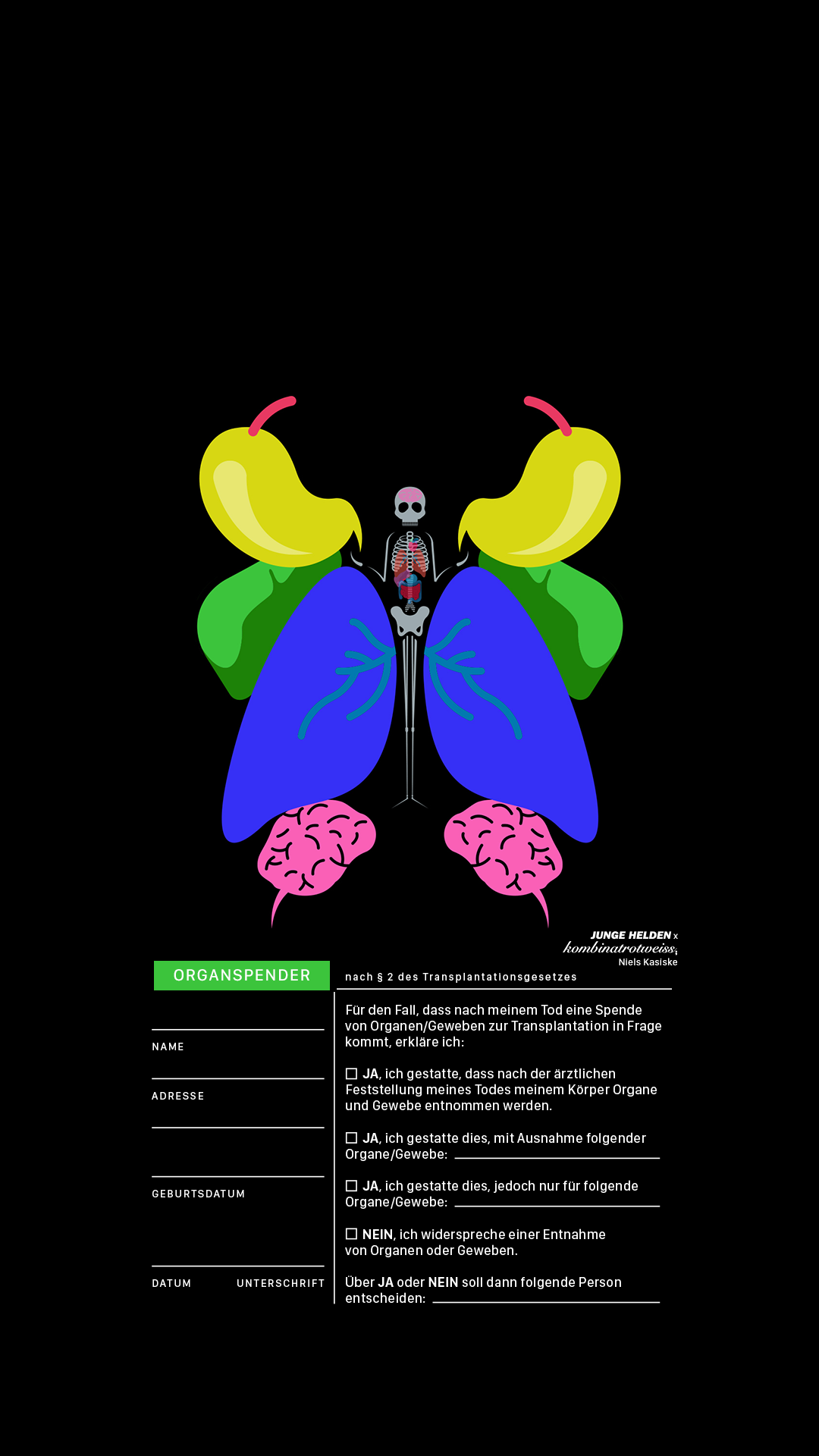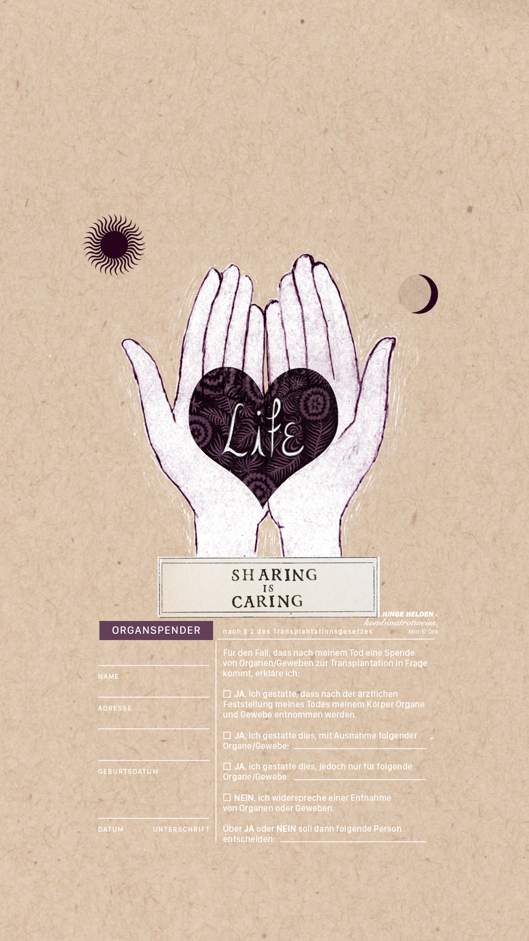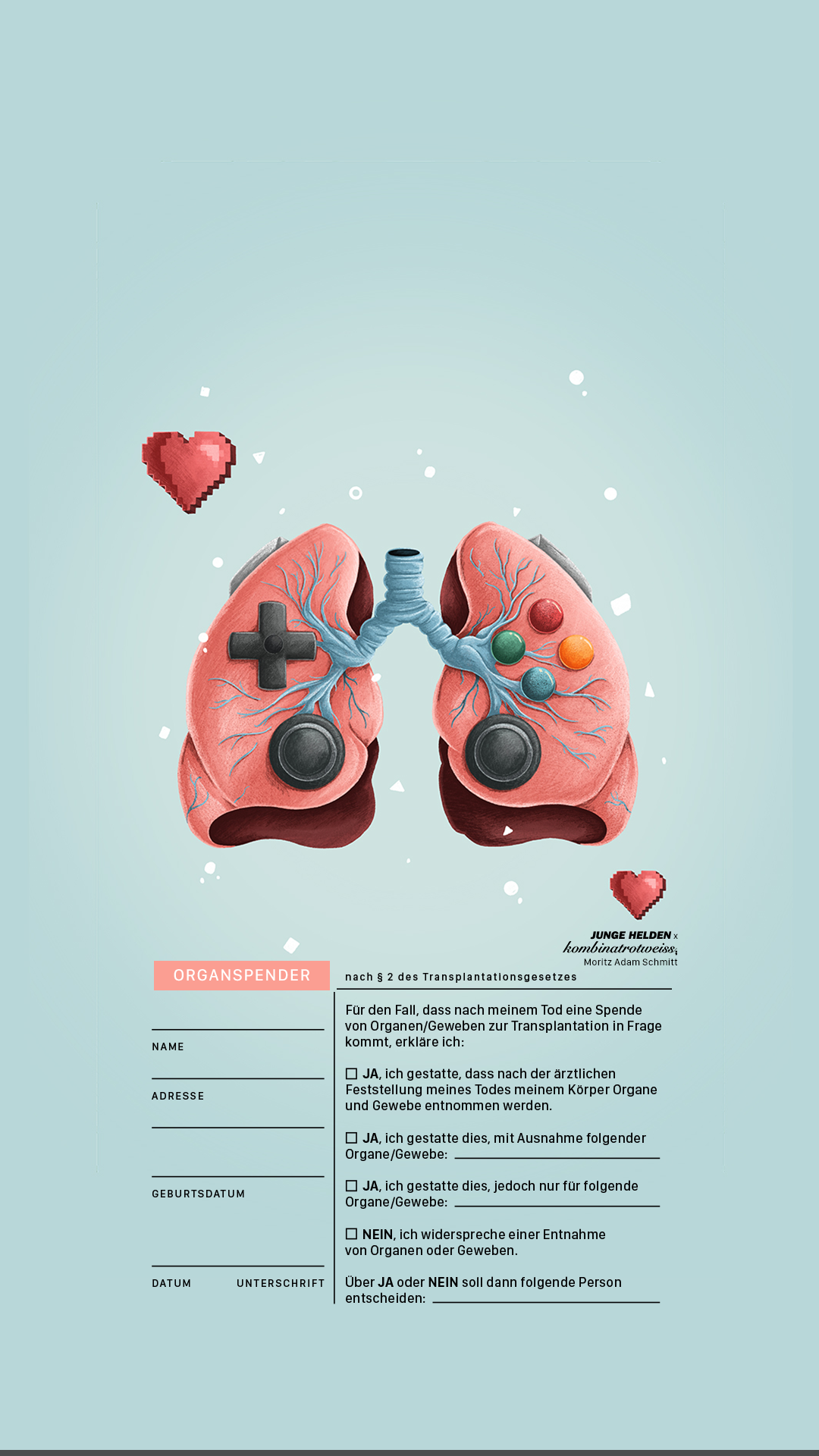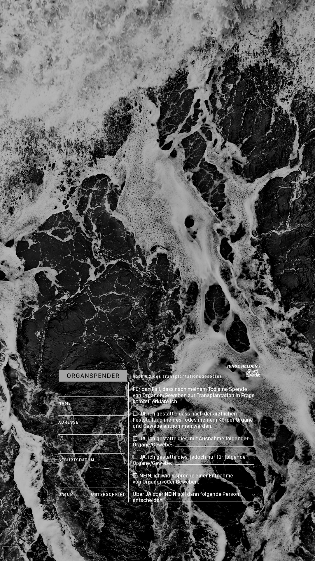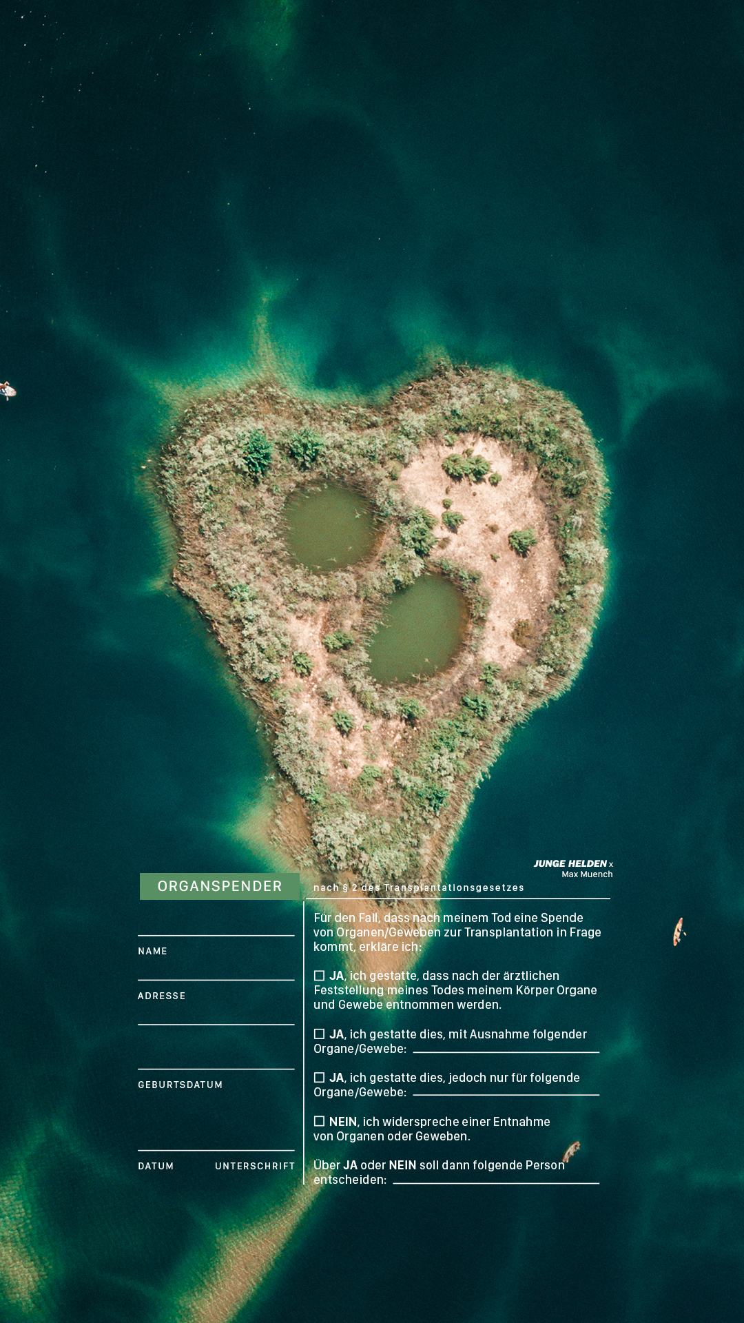 Hier kommt der erste Organspendeausweis fürs Handy! Durch die Life Saving Wallpapers lässt sich der Organspendeausweis mit ein paar Klicks als Wallpaper aufs Handy laden. Du kannst Dir hier eines von knapp 60 Motiven aussuchen, bequem auf dem Handy oder dem Computer bearbeiten und dann als Sperrbildschirm einstellen. Oder nimmst das Overlay und machst Dein eigenes Motiv zum Life Saving Wallpaper.