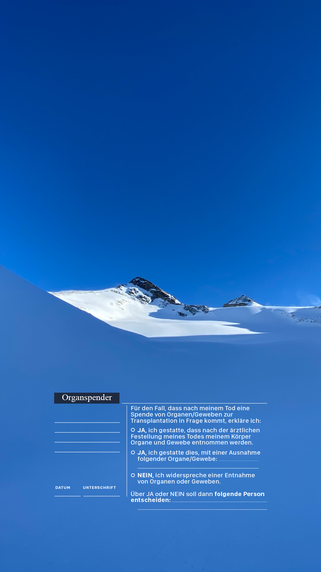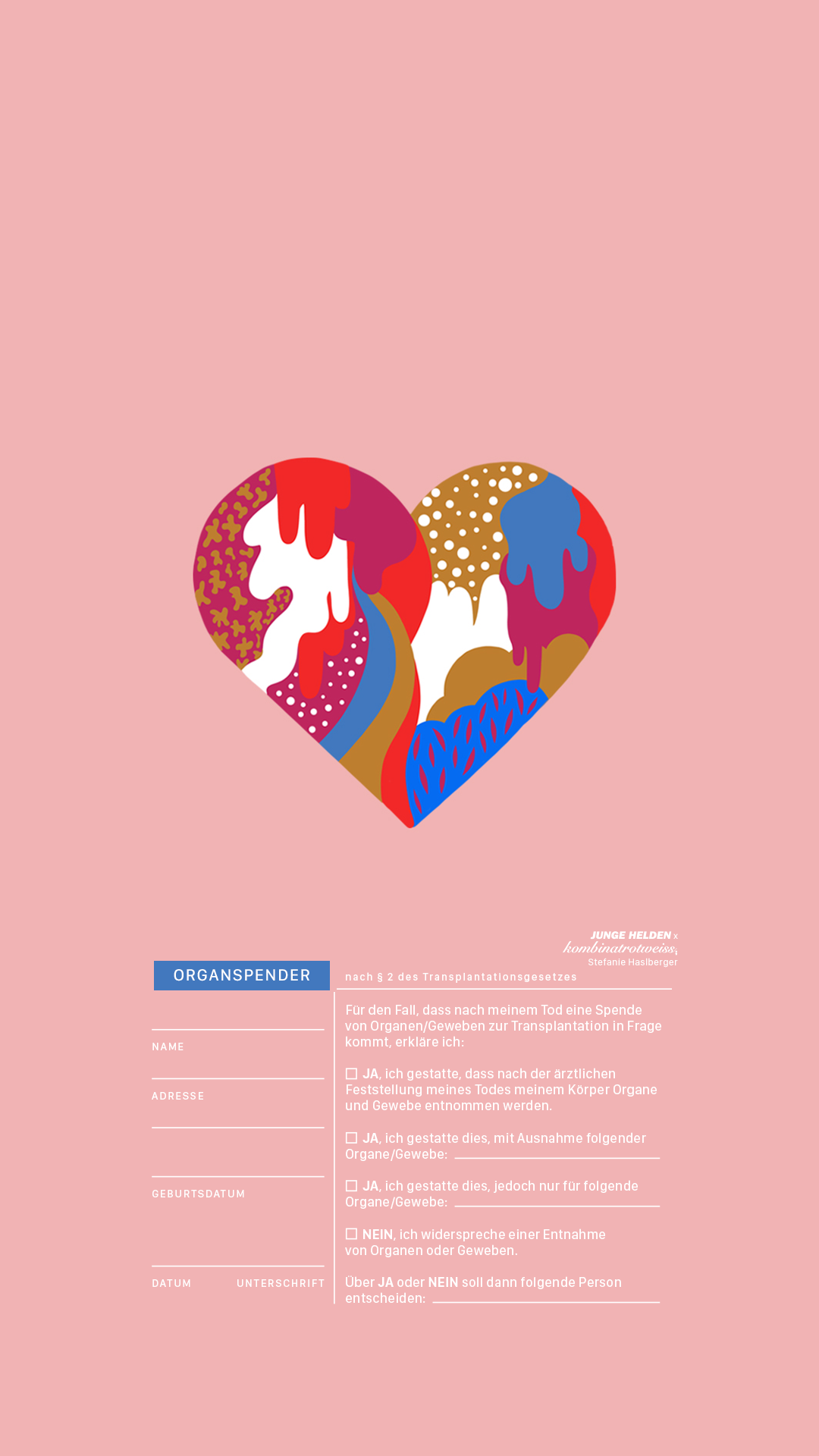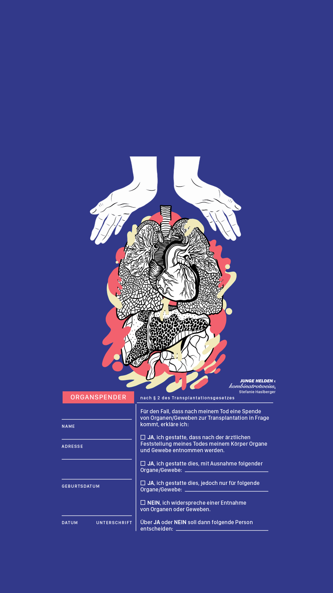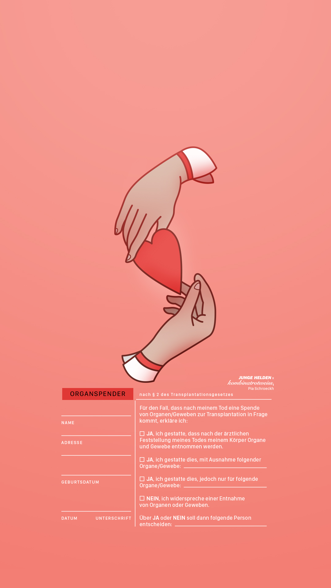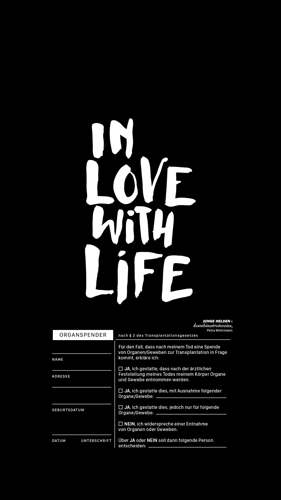 Hier kommt der erste Organspendeausweis fürs Handy! Durch die Life Saving Wallpapers lässt sich der Organspendeausweis mit ein paar Klicks als Wallpaper aufs Handy laden. Du kannst Dir hier eines von knapp 60 Motiven aussuchen, bequem auf dem Handy oder dem Computer bearbeiten und dann als Sperrbildschirm einstellen. Oder nimmst das Overlay und machst Dein eigenes Motiv zum Life Saving Wallpaper.